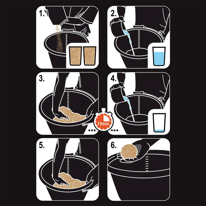 On commence tout d’abord par verser les 3/4 du volume d’eau nécessaire en mélangeant énergétiquement avec la main dans un seau rond pour permettre aux particules de l’amorce de se gorger d’eau.