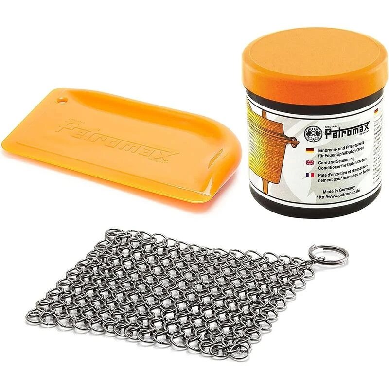 Le pratique ensemble d’accessoires Petromax Dutch Oven comprend un conditionneur d’entretien et de mise en place pour fonte, un racloir et un nettoyeur à mailles.