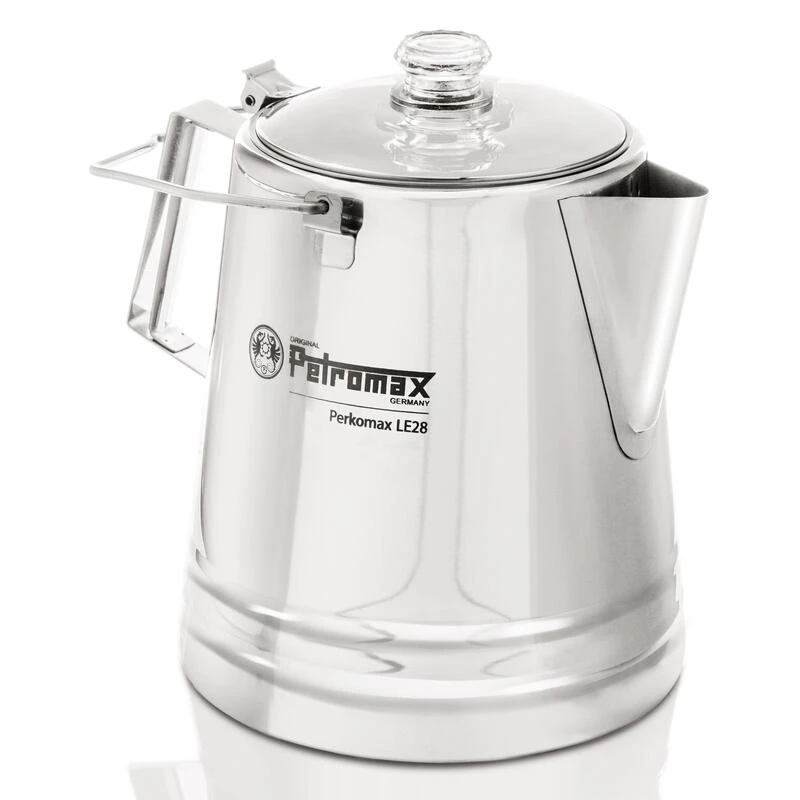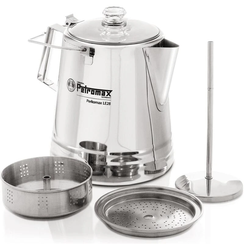 Percolateur en acier inoxydable durable avec une molette en verre. Préparez le meilleur café sur votre feu de camp. Jusqu’à 28 tasses de café !